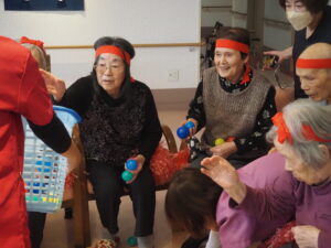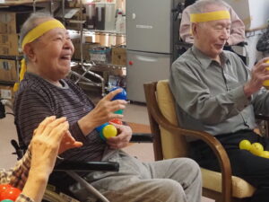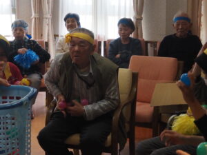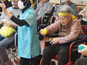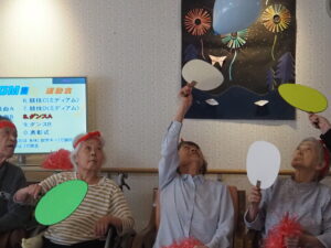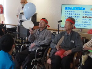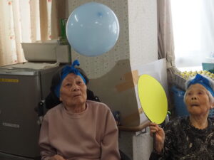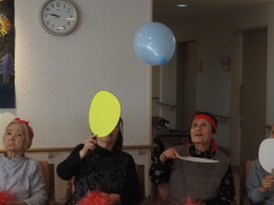 うちわを使って風船を送っていき、ゴールの方まで早くまわせたチームが勝ち✨