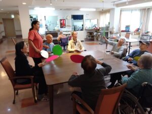新聞紙を置いてカラフルうちわであおいで落とすゲームも盛り上がりました☆