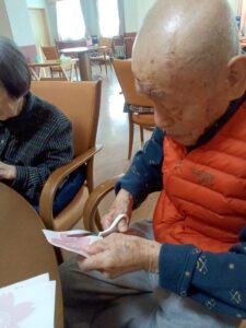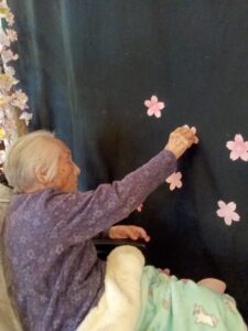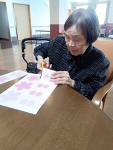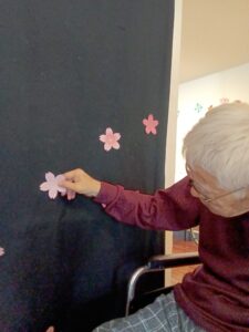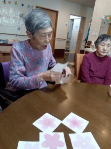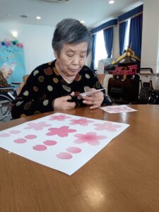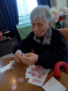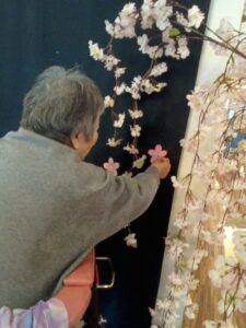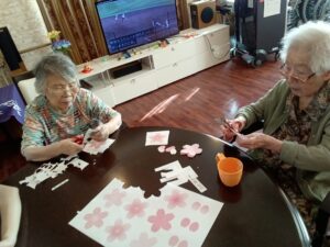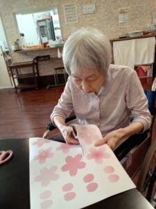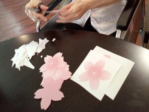 みんなで桜の花びらを切り、玄関に飾り付けをしましたー🌸